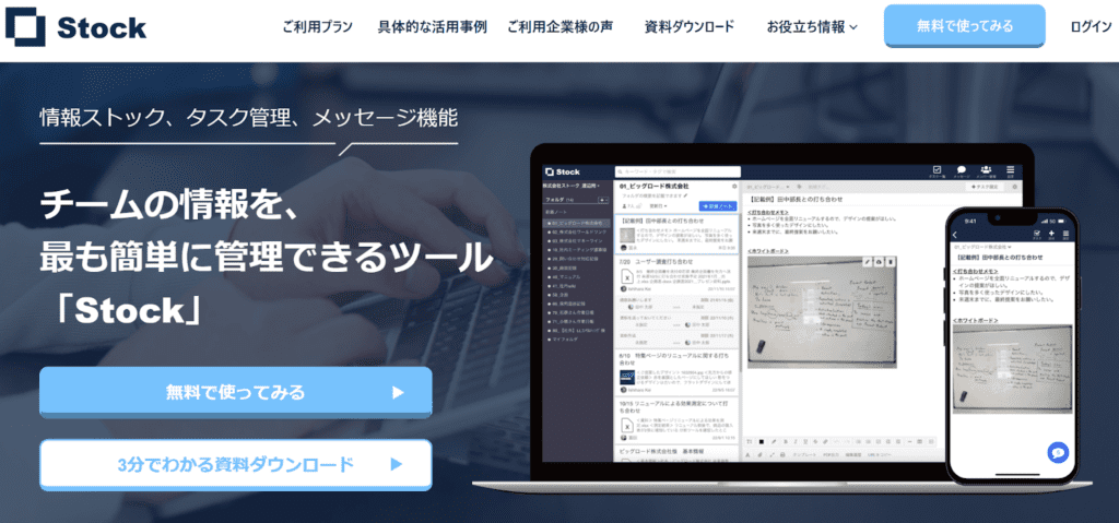 Stockは、公式サイトによると24万社以上で導入されている情報管理ツールです。(※2026年1月時点)非常にシンプルなインターフェースが採用されており、情報の迅速な把握に役立ちます。タスク管理やメッセージ機能も実装されているため、情報に紐付くタスク管理やコミュニケーションでも活用できます。また、無料かつ無制限で社外のクライアントや取引先を招待でき、社外の人との情報共有にも有効です。