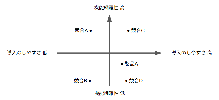 「機能網羅性」×「導入のしやすさ」の2軸で配置されたところ、競合A・Cは機能網羅型として右上、競合B・Dは導入容易性に振った左下、製品Aは中央やや右下という分布になりました。