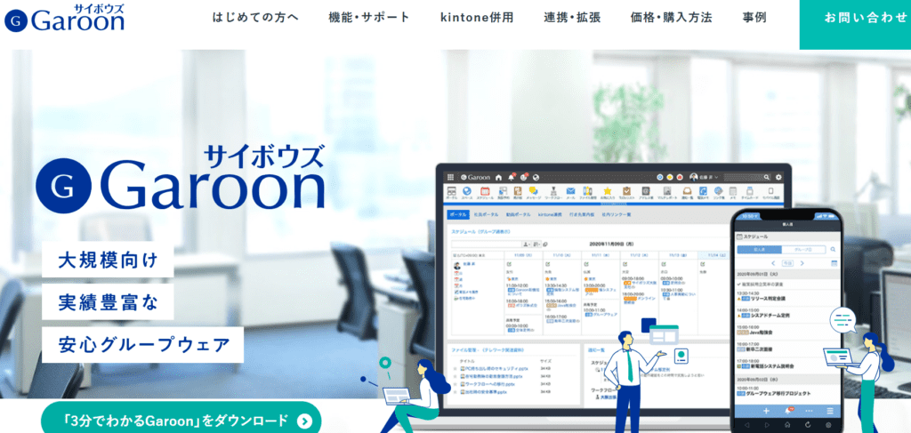 Garoonは、7,500社330万人の導入実績を持つグループウェアです。スケジュール管理以外にも、メッセージや掲示板、ワークフロー機能などが実装されており、さまざまなシーンで活用可能です。