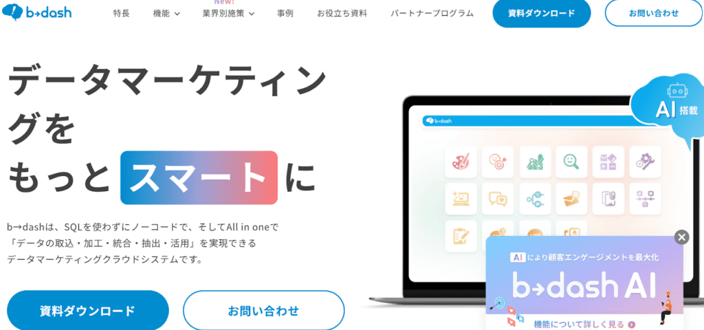 b→dashは、ノーコードでデータの取り込み・加工・統合・抽出・活用が可能なデータマーケティングクラウドシステムです。導入社数は1,200社以上で、会社規模・業界問わず多くの企業で利用されています。BI以外にもCDPやMA、Web接客など複数の機能が実装されており、さまざまなシーンで活用可能です。