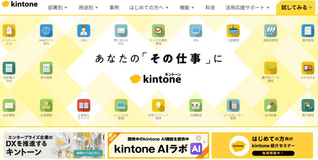 kintoneは、導入社数3万社を突破した業務アプリ開発ツールです。ドラック&ドロップで業務アプリの開発・改善が可能で、素早い導入・改善を実現できます。多くの外部ツールと連携でき、業務効率化に役立ちます。