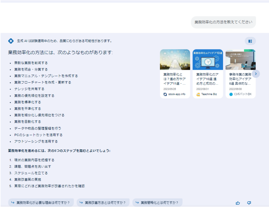 (参考:「グーグル、日本語版 生成AI検索「SGE」をSearch Labsで試験運用開始」/ASCII)