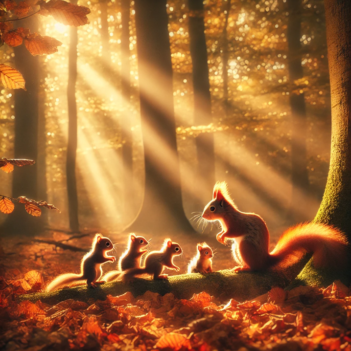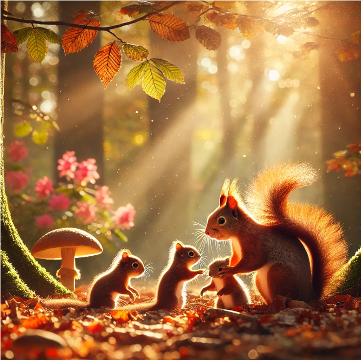 • 主題:木漏れ日の中で遊ぶリスの親子