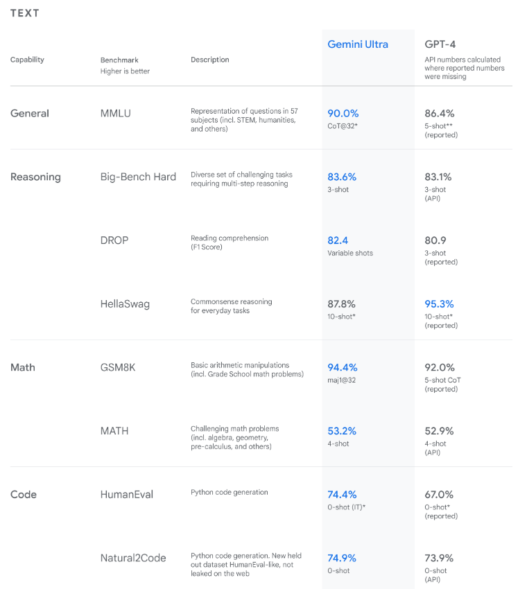 実際に以下が、Googleが調査・発表したGeminiの性能に関するデータです。