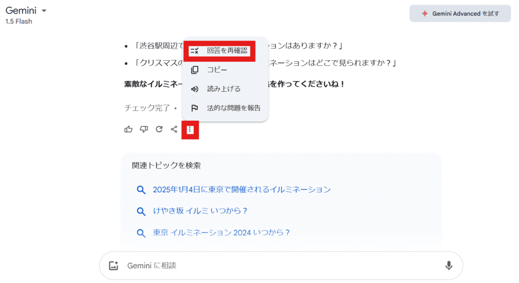 利用方法は非常に簡単で「︙(ケバブメニュー)」を選択後「回答を再確認」をクリックするだけです。