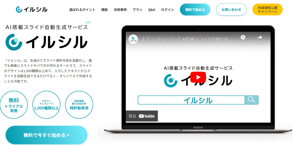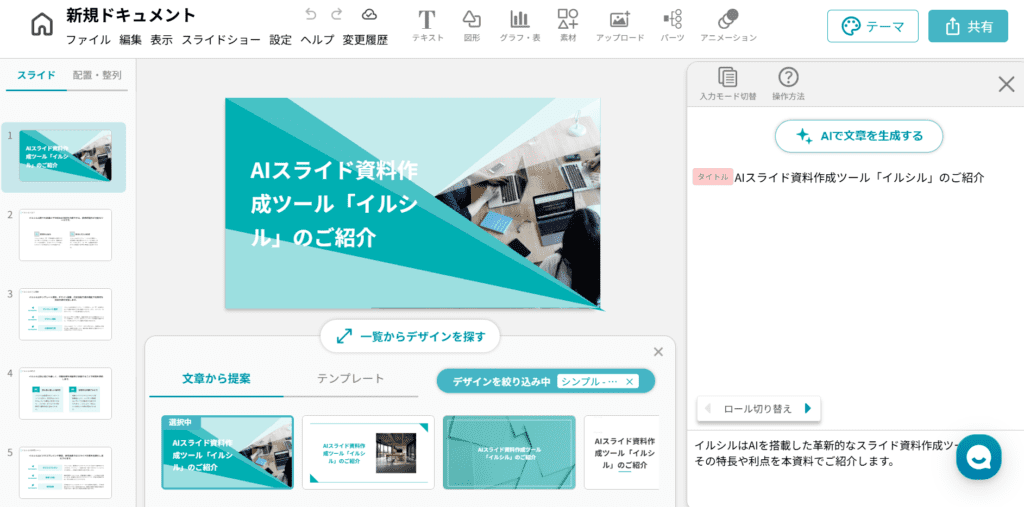 イルシルは、日本企業の株式会社イルシルが開発・提供しているAI搭載のスライド自動生成ツールです。2024年5月時点で5万人のユーザーを獲得しており、注目度の高さが伺えます。入力したテキストデータを基に、AIがスライドを生成してくれるため、資料作成の効率化が見込めます。また、数多くのデザインテンプレートが用意されており、品質の向上が期待できるでしょう。