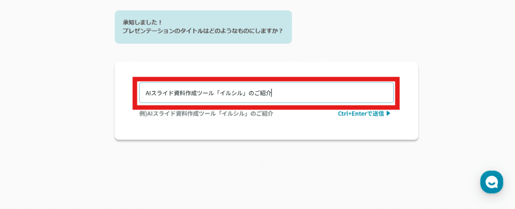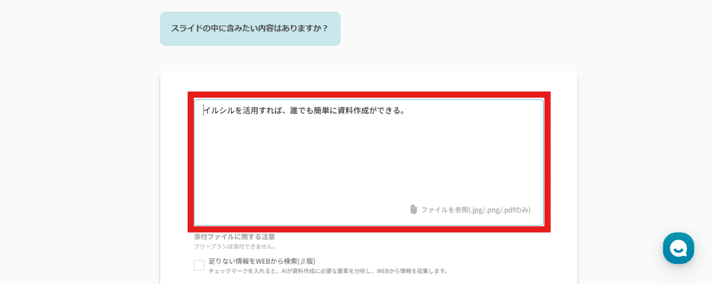 次に、資料に盛り込みたい内容を入力して、Ctrl+Enterをクリックします。プランによっては、ファイル添付による情報入力や足りない情報のWeb検索も可能です。