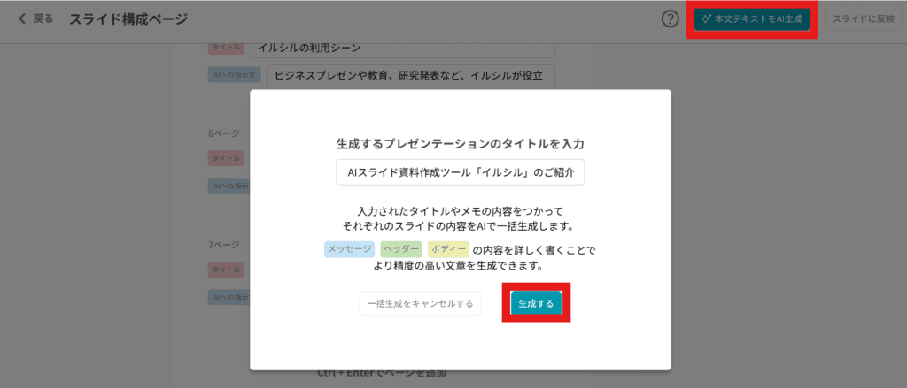 内容を確認して、問題がなければ右上の「本文テキストをAI生成」ボタンをクリックし、表示画面で「生成する」ボタンを選択しましょう。