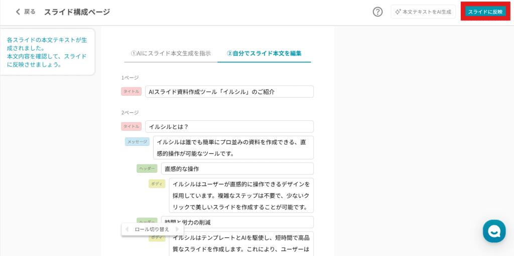 数秒待つと、本文テキストが生成されます。確認して問題なければ、画面右上の「スライドに反映」ボタンをクリックします。