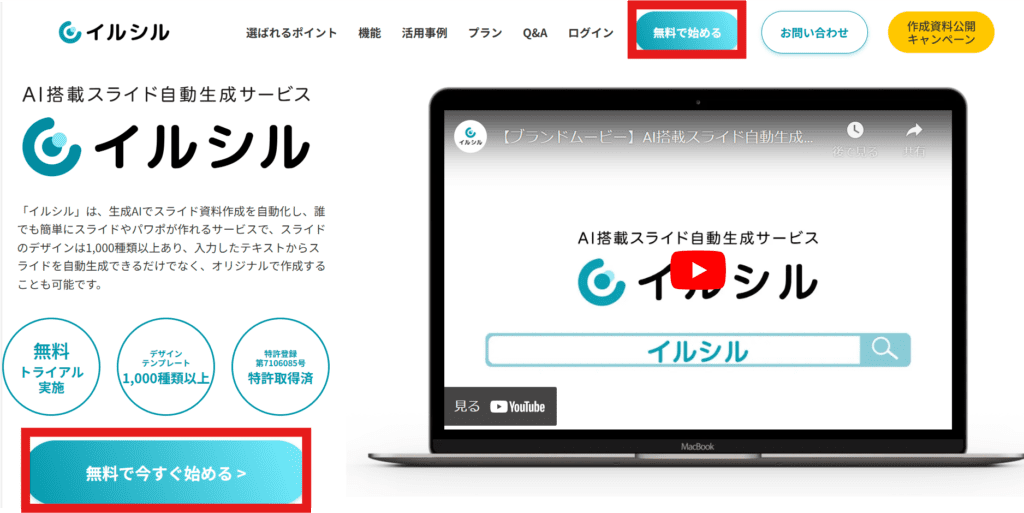 まず、イルシルの公式Webサイトにアクセスして「無料で今すぐ始める」もしくは「無料で始める」ボタンをクリックします。