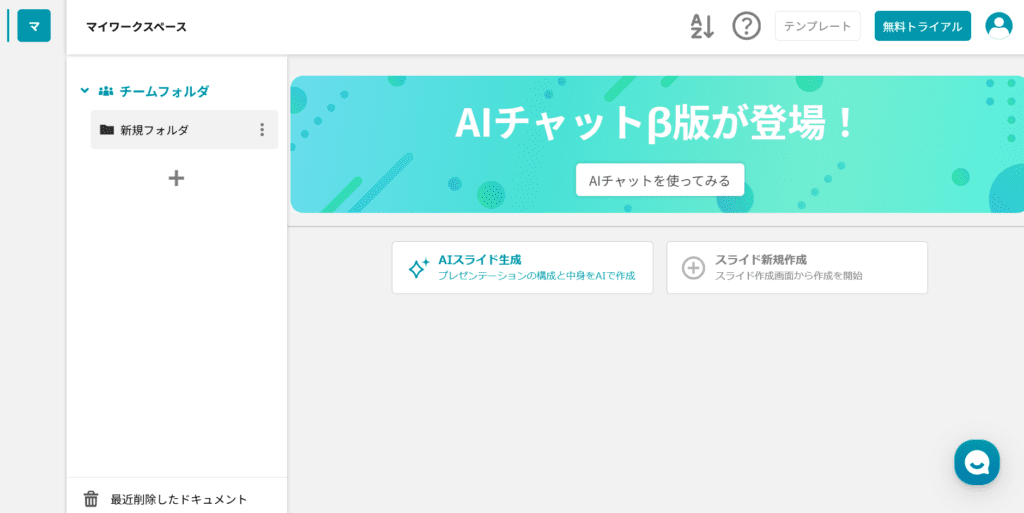 活用方法は非常に簡単です。まず、画面中央にある「AIスライド生成」ボタンをクリックしましょう。
