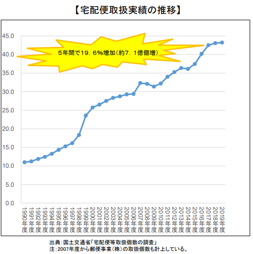 国土交通省によると、2018年と2019年の宅配便取扱個数は表の通りとなっており、ここ5年間の増加率を見ても、まだまだ増加する傾向が伺えます。