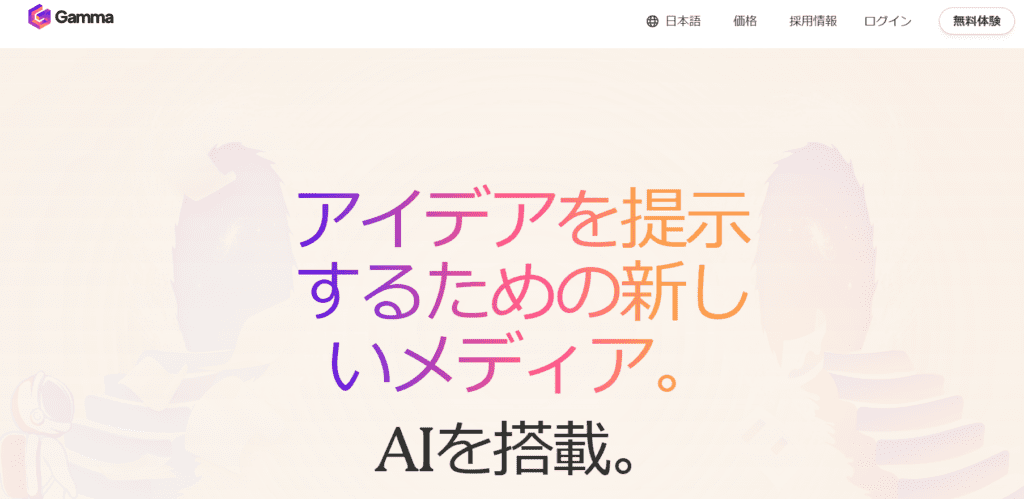 Gammaは、プレゼンテーションやWebサイトなどを数秒かつ無制限に作成可能なツールです。テキストだけでなく、デザイン生成もできます。また、表やチャート作成もでき、視覚的にわかりやすい資料の作成に有効です。
