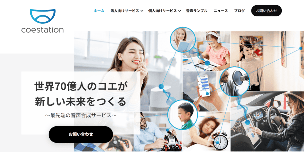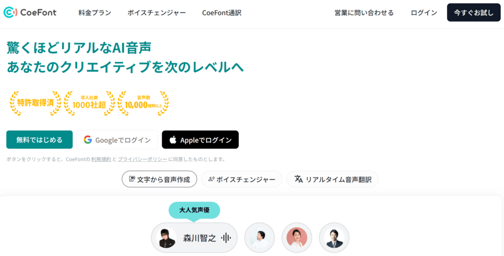 CoeFontは、特許を取得しており1,000社以上の導入実績を誇るツールです。テキスト読み上げだけでなく、ボイスチェンジャーやリアルタイム音声翻訳機能も実装されています。