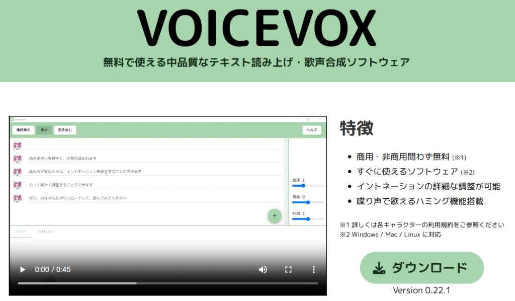 VOICEVOXは、商用利用であっても無料で利用可能なテキスト読み上げ・音声合成ソフトです。日本人が開発したソフトであるため、日本人ユーザーが利用しやすい操作性になっています。