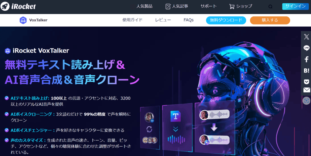 VoxTalkerは、100以上の言語やアクセントに対応しているツールです。キャラクターや有名人を含め3,200以上の音声で発声できます。音声をテキストに変換したり、ラップを生成したりすることも可能です。