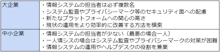 中小企業だけでは情報システムに対する意識がどの程度なのか、伝わりにくいかもしれません。そこで、大企業と中小企業の情報システムの意識の差を比較してみます。あくまで比較であり全ての企業が下記の通りに当てはまるわけではありません。