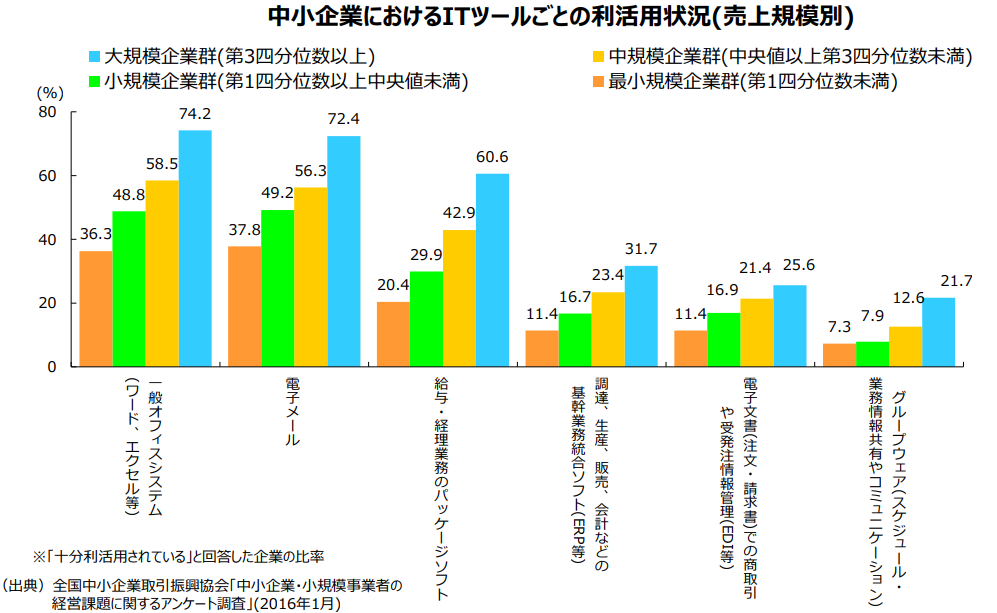 大企業と中小企業では、どちらが適切に情報システムを運用できるか、言うまでもなく大企業です。また、情報システムに限った話ではなく、大企業と中小企業ではITツールの活用状況にも大きな差が開いています。
