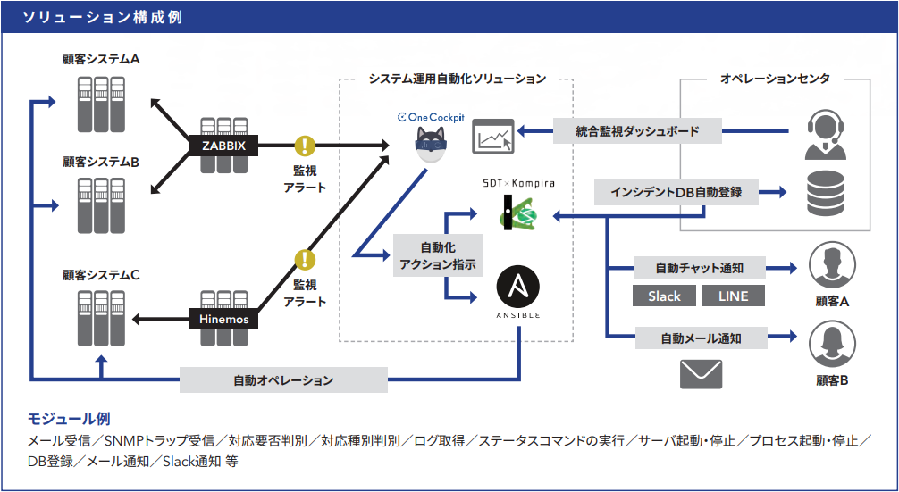 その他の監視ツールとの併用や監視後のアクションに繋げるソリューションについてもお気軽にご相談ください。OneCockpit、SDT×Kompira、Ansibleといったツールを組み合わせた自動化ソリューションを提供しています。