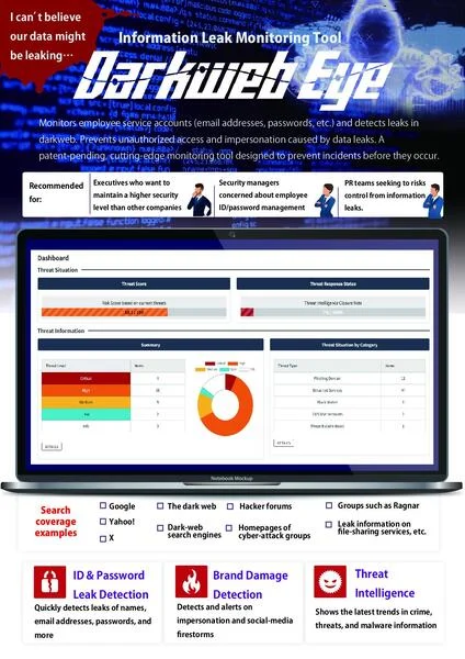 ダークウェブ上の情報漏洩の脅威から会社を守る情報漏洩監視ツール「ダークウェブアイ」のサービス紹介資料です。近年の情報漏洩の状況や製品の機能をご紹介します。