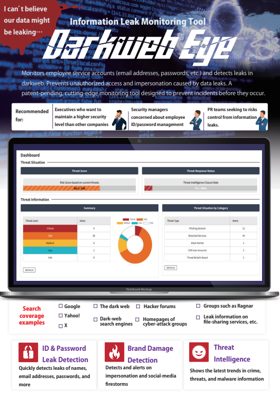 ダークウェブ上の情報漏洩の脅威から会社を守る情報漏洩監視ツール「ダークウェブアイ」のサービス紹介資料です。近年の情報漏洩の状況や製品の機能をご紹介します。
