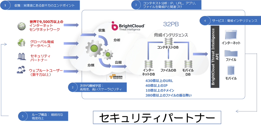 脅威情報には、オープンテキスト社の「Threat Intelligence(BrightCloud)」を採用しており、機械学習を活用して常に最新の情報に基づいたチェックを行います。