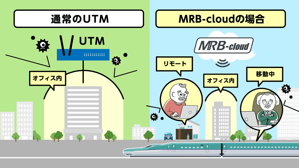 MRB-cloudとは、働く場所を問わず、インターネット通信を一元的に保護できる